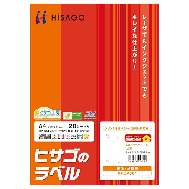 商品名:ヒサゴ 宛名ラベル ヒサゴのラベル A4 タックシール 12面 20シート OP861