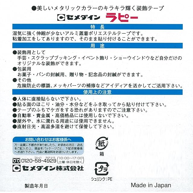 用途:手芸・スクラップブッキング・イベント飾り・ショーウィンドウ等の装飾・包装・危険防止の標識・メッキパーツの補修等