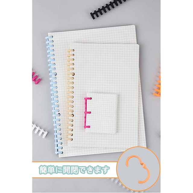 【特徴】リング長さをハサミでカットできるので、さまざまなサイズの紙に適しています:30穴/A4、26穴/B5、20穴/A5。