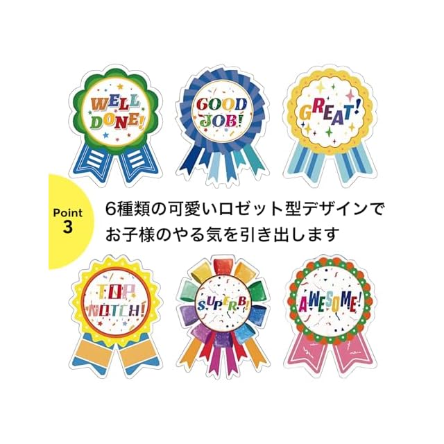 【学習や生活習慣のご褒美に最適】「GOOD JOB!」や「GREAT!」などバリエーションに富んだ誉め言葉の英語フレーズ入り。ポップな色合いの勲章風スタイルで、もらって嬉しいデザイン。達成感や自信を与えるご褒美シールです。英語表記なので知育にも役立ちます。