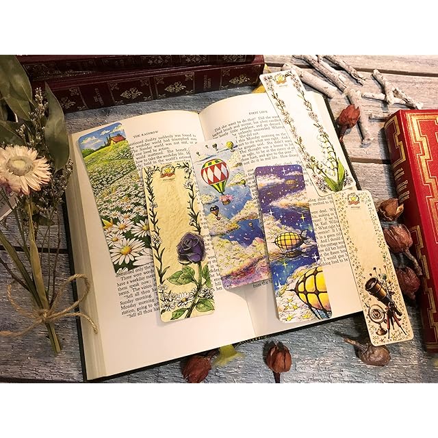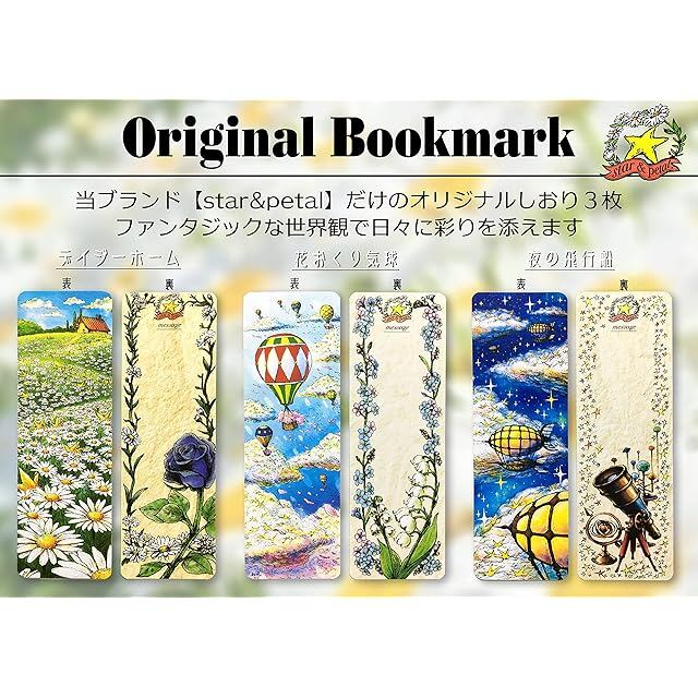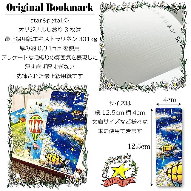 【オリジナルしおり】『star&petalオリジナルしおり』は他にはない幻想的な絵柄のしおりで、子供から大人まで楽しんでいただけます。『デイジーホーム』『花おくり気球』『夜の飛行船』の3枚。サイズは幅4cm×12.5cmなので文庫サイズにも収まり、さまざまな本にご使用できます。材質は最上級紙『エキストラリネン』を使用しようしており、まるで毛織りの表面のような質感。手触りも良いです。