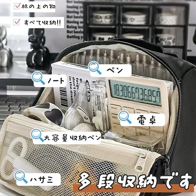 【複数の仕切りポケット】内側はファスナー付きの網ポケットを搭載し、6つのメッシュ仕切り小物や文房具を分けて収納できます。また、背面ポケットには小型計算機やメモ帳を収納可能です。