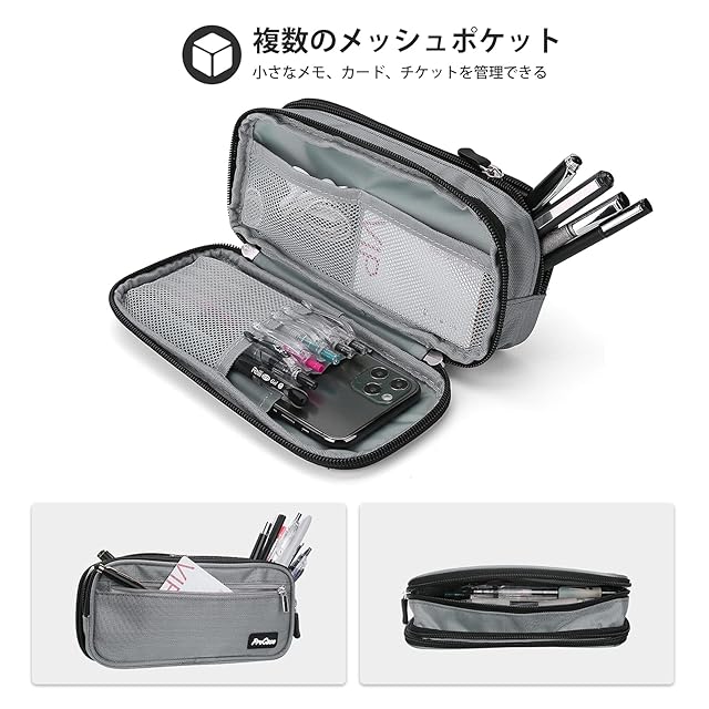 ProCase ペンケース 大容量 筆箱 シンプル 機能的 学生用 社会人用 多機能 – グレー