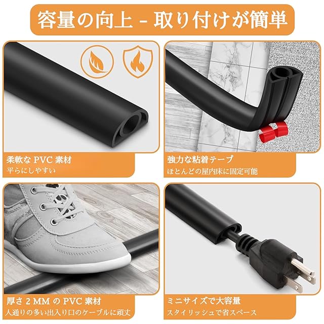 【取り付け簡単】延長配線モールは自己粘着設計を採用しており、背面のテープを剥がすだけで簡単に床に固定できます。フロアコードハイダーの長さを短くする必要がある場合は、ハサミで簡単にカットできます。ご注文の前に、ケーブルまたはコードのサイズを確認してください。