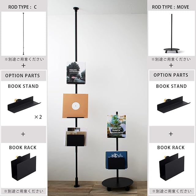 Tension Rod / Move Rod と組み合わせて使用できる、縦専用アクセサリーのブックスタンドです。お気に入りの本やアート、レコードを飾ることで、自分らしさを表現できるインテリアを作ることができます。
