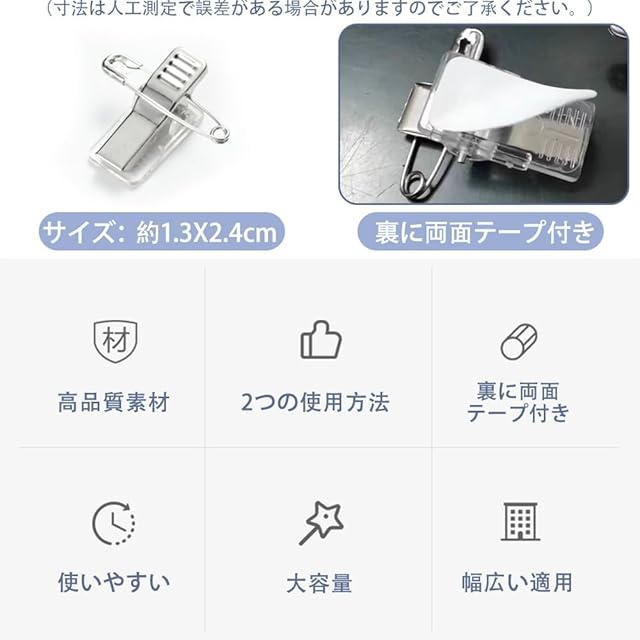 セット内容:安全ピン・クリップ両用クリップ20枚セット、サイズ:約1.3X2.4cm。