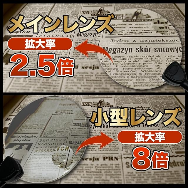 商品名 :卓上スタンドルーペ 倍率 :メインレンズ2.5倍/エイドレンズ8倍 レンズ直径 :110mm レンズ材質 :アクリルレンズ ライト :LED 2個 アーム長さ :20cm 電池 タイプ :単四乾電池3本(付属しておりません。別途ご用意ください)