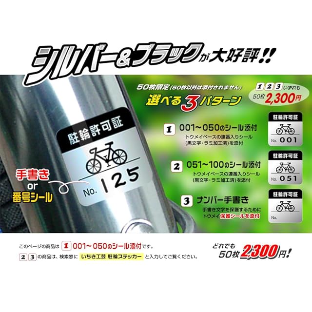 商品名:【連番 50枚】 シルバーベースがキレイな駐輪ステッカー 「001-050」迄の番号シール添付 全面ラミネートの耐候・防水シール KR31-001