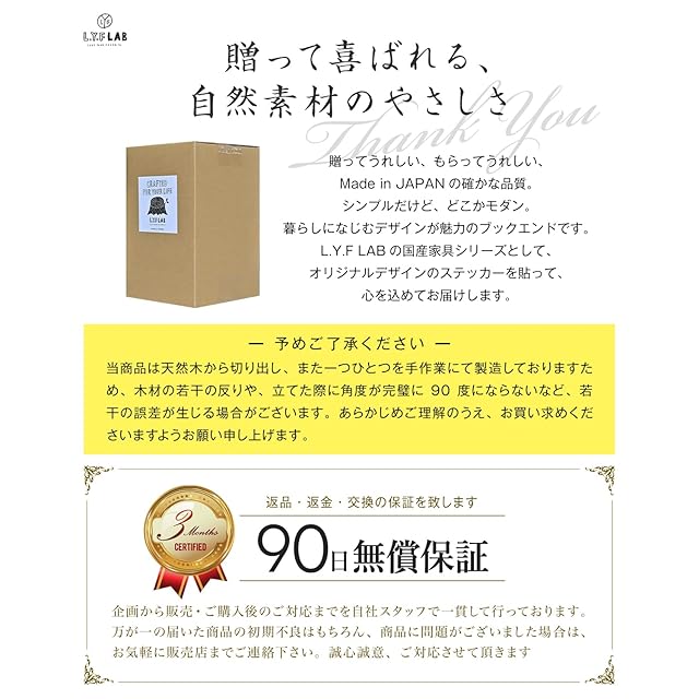 L.Y.F LAB 【 日本製 】 国産ひのき 本立て ブックエンド 倒れない 木製 【 職人手仕事の温もり 】 おしゃれ 卓上 ブックスタンド シンプル ナチュラル 可愛い 本棚 仕切り ギフト