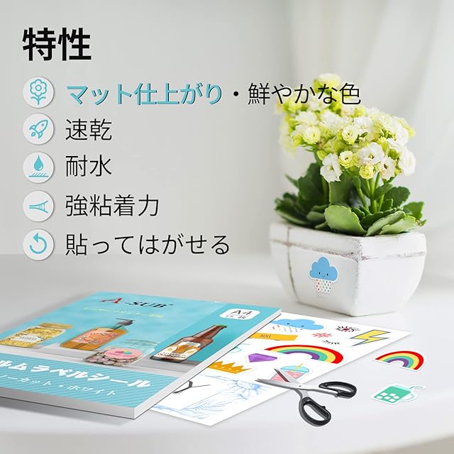 特性:貼ってはがせるタイプ。速乾、鮮やかな発色、つやなし仕上がりです。強粘着力的なラベルとして、貼り付けやすい