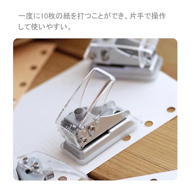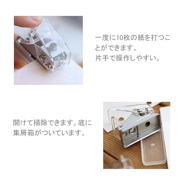 【商品詳細】ミニ単孔パンチャー、サイズ:50*23*46mm、穴径:6mm、一度に約10枚の紙を打つことができる。