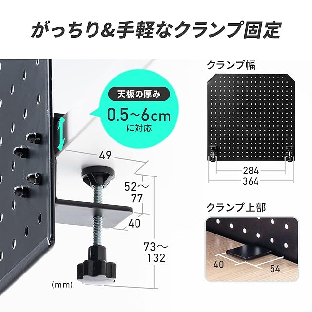 クランプ で デスク に 後付け ができる 有孔ボード です。クランプは、0.5~6cmまでの厚みの天板に対応し、がっちり固定できます.