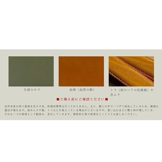 ※検品時に一度ホックを留めるために曲げるため、それを伸ばした際に曲げシワが残っている場合がございます。使用時(U字に曲げる)には曲げシワは消えますので革の特性としてご了承下さい。その他革本来のキズ、シワ、黒点などの特徴がございます。(詳細は画像をご覧下さい。)
