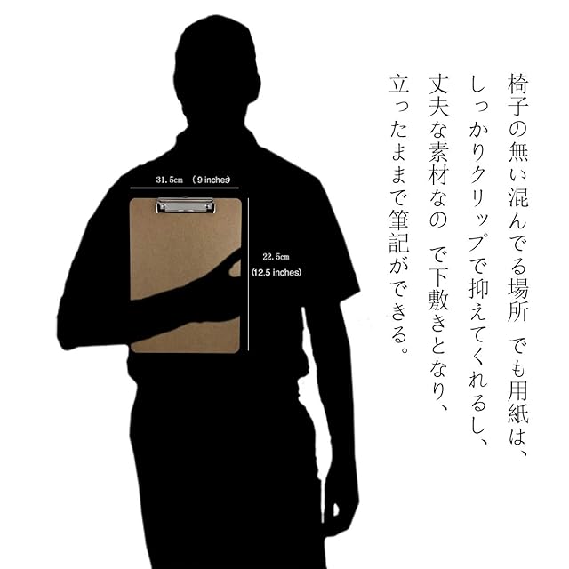 椅子の無い混んでる場所 でも用紙は、しっかりクリップで抑えてくれるし、丈夫な素材なの で下敷きとなり、立ったままで筆記ができる。