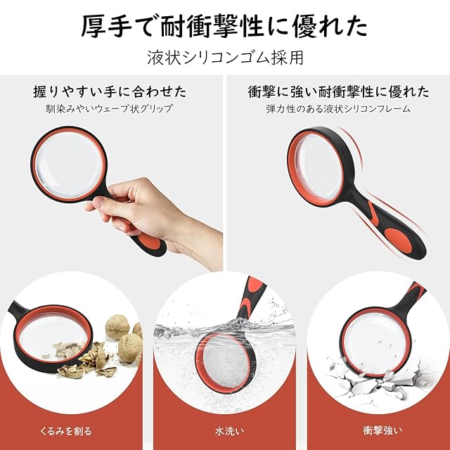 「落下に強い耐衝撃フレーム設計」レンズ周辺には弾力性のある高品質シリコーンゴムを採用し、万一の落下時でも割れにくく、長く安心してご使用いただけます。握り部分は滑りにくいウェーブ形状で、しっかりと保持できます。
