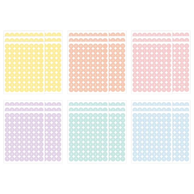 6色のステッカーが3枚ずつ入っている18枚の構成です。 0から9までの数字のステッカーは一枚に7個ずつ入っていて、記号は5個ずつ入っています。