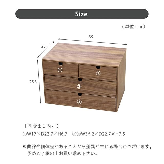 木製収納ボックス3段【サイズ】幅39×奥行25×高さ25.4 引出し内寸法:(大)幅36.2×奥行22.7x高さ7.3/(小)幅17×奥行22.7x高さ7.3(cm)【素材】タモ突板/ウォールナット突板/MDF 裏面・内側:プリント紙