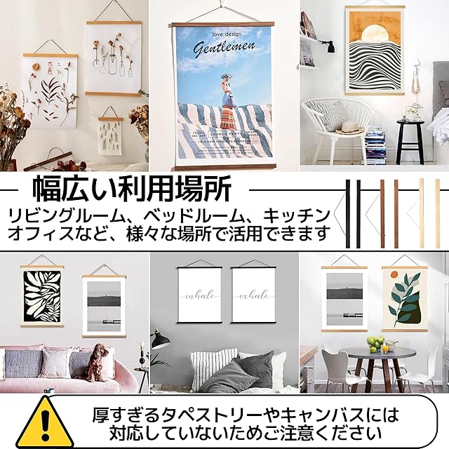 【仕様】ポスターハンガーのサイズ:21x2cm、素材:MDF、セット内容:タペストリー棒 2点セット(計4本)、ストラップ2本