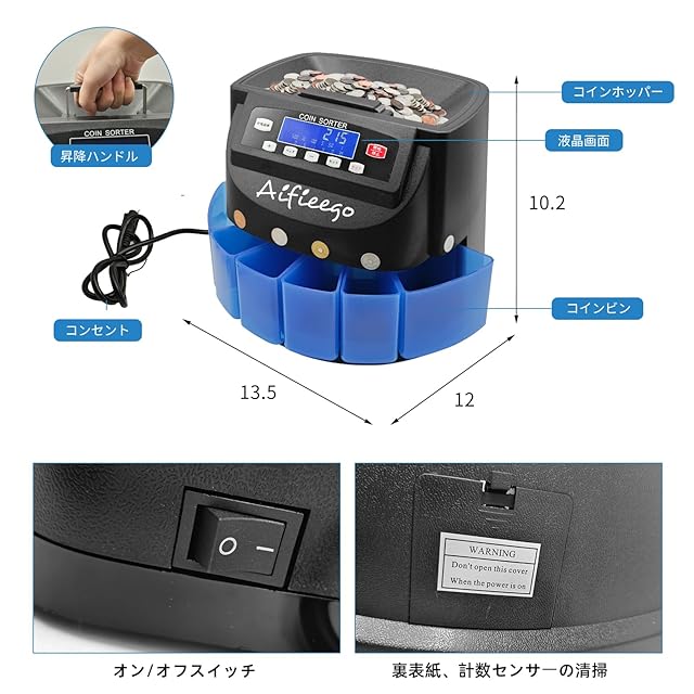 高精度コインカウンター :高精度自動コインカウンター、硬貨計数機で効率的に小銭をカウント。このコインカウンターは、500円、100円、50円、10円、5円、1円などさまざまな硬貨に対応しています 最速速度、毎分270枚 直径15mmの硬貨