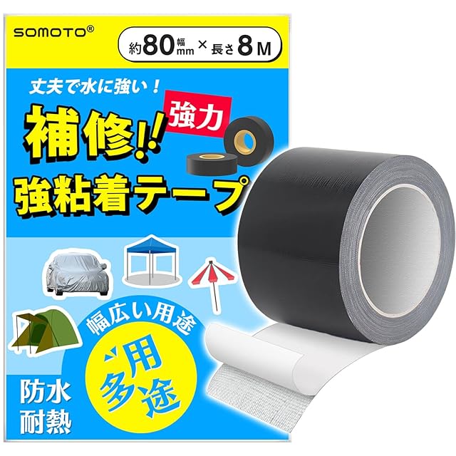 SOMOTO 補修テープ テント シート補修テープ 【強力ガラス繊維と絶縁アルミ箔採用】 タープ補修 バイクシート 超強力 多用途 高耐久 縫い目 穴修理 撥水処理 表面絶縁のアルミ加固 水・日光・熱に強い トラックシート 寝袋 オーニング レインコート ビニール補修 黒 8cm×8M