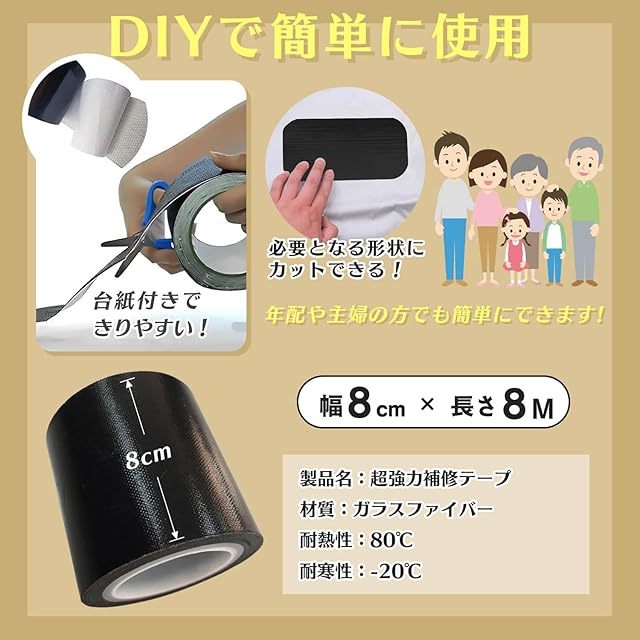 『自由にカット&便利な使用』SOMOTOの補修テープはグラスファイバーで補強されており、これまで補修テープの接着力に不満を抱いていた方はぜひお試しください。防水効果も抜群で、水や雨に当たっても安心です。テント、タープ、パラソル、傘など、屋外での使用でも優れた補修効果が得られます。屋内はもちろん、屋外でもその粘着力を十分に発揮し、幅は8cmで、修繕したい箇所のサイズに合わせて自由に調整できます。