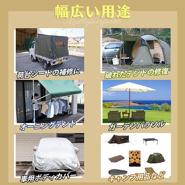 『色んな場所で使える超強な粘着力』SOMOTO テント補修テープは様々な素材に使用でき、織物の破損をしっかり補修し、日よけやタープの補修、パラソル、ナイロン、キャンバス、人工皮革、各種プラスチックなど多岐にわたる素材の修理に適しています。窓、屋外用品、浴槽、タイルなどの仮修理にも使えます。SOMOTO 補修テープはほとんどのものを修理し、持っていると心強いアイテムです。