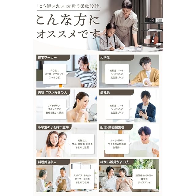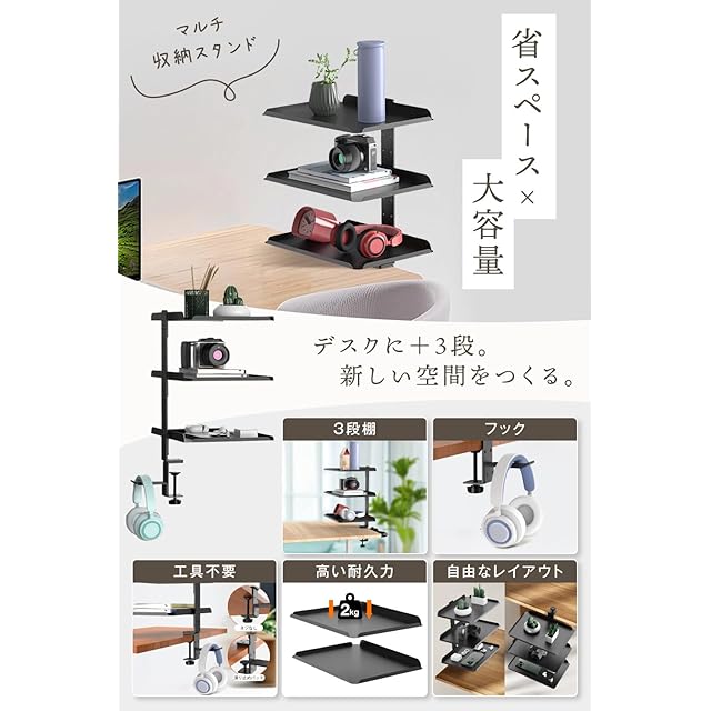 ✅【省スペースで作業環境を拡張】 デスクの横に取り付けるだけで収納力を格段にアップするマルチ収納スタンド。デッドスペースを有効活用できるため、限られた作業スペースでも快適に使えます。文房具やリモコン、小物入れ、カップホルダーとしても使える万能アイテムで、デスク周りの整理整頓が驚くほどラクに。テーブルや書斎デスク、スタンディングデスクとの相性も抜群です。