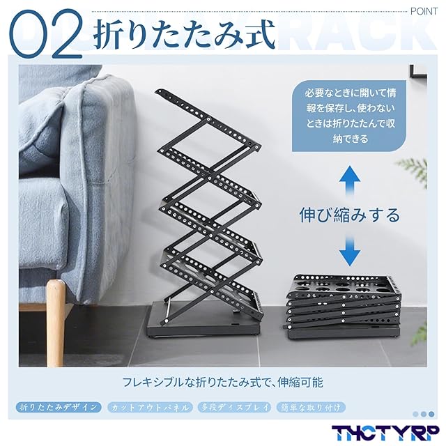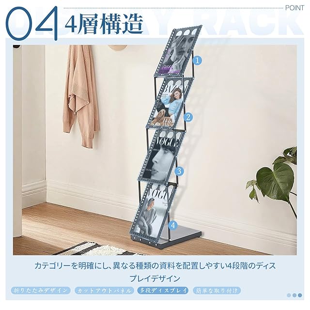 THCTYRP 折りたたみ式 4層 マガジンラック カタログスタンド A4対応 アイアン製 ディスプレイラック 片面パンフレットホルダー 省スペース 展示会/リビング/寝室用 コンパクト収納 (ブラック)