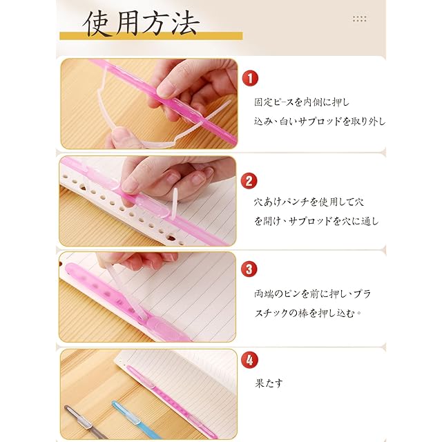 【製本方法】バインダーからゴム紐を取り外し、紙をパンチした後、バインダーのバックルを紙の穴に合わせ、両端のラッチを前に押し込み、プラスチックストリップを押し込むだけで製本完了です。