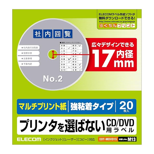 エレコム CD/DVDラベル 内径17mm 強粘着 プリンタ兼用 20枚入 EDT-MDVD1S