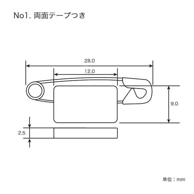 NO.1 安全ピン:全長27mm 座板:長さ13mm×幅9mm×厚さ2.5mm NO.2 安全ピン:全長31mm 座板:長さ16mm×幅9mm×厚さ2.5mm NO.3 安全ピン:全長38mm 座板:長さ20mm×幅10mm×厚さ2.8mm