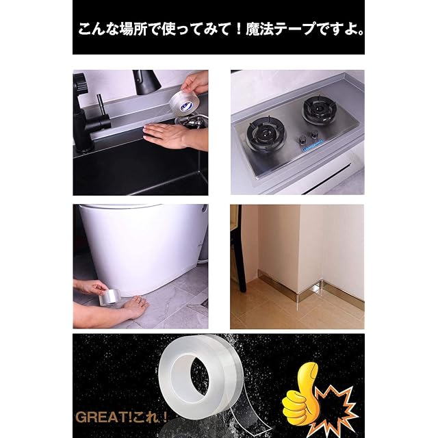 【粘着性抜群】普通の補修テープと違い、本テープは一番高級のアクリルゴムとPVCで作られ、粘着性はものすごく高くて、長持ちできます。環境にも優しくて実用性が高い、無毒で変な匂いも決してございません。そして、一番大人気なのはのりすら残らない特徴です!剥がした跡が残りにくい素材を使用しているため、残らないです。キッチン周りやトイレにも使える!