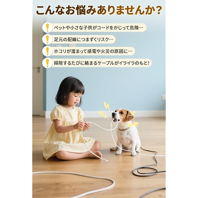 【高品質PVC素材・難燃性&耐久性】 丈夫なPVC素材を採用し、耐摩耗性・難燃性に優れています。長期間使用しても黄ばみにくく、踏んでも割れにくい柔軟性を備えています。お子様やペットによる配線へのいたずらや損傷も防ぎます。