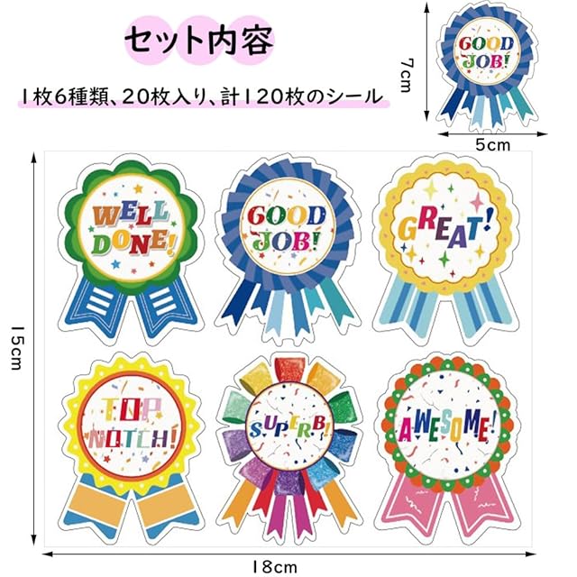 商品名:サムコス よくできましたシール ご褒美シール 6種120枚 可愛いシール 大きい ごほうび ロゼット シール 勲章シール ご褒美 ごほうびシール 卒園おめでとう シール