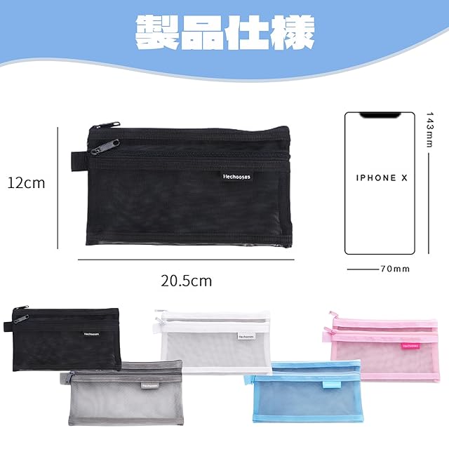 【製品仕様】私たちは2種類のサイズのペンケースを提供しています:単品と2個セット。サイズ:20.5×12cm。重量:21g。多様な色展開で、ブラック、ホワイト、グレー、ピンク、ブルー、そしてユニークなブラックとグレーの組み合わせがあり、異なるユーザーの個別のニーズに応えます。