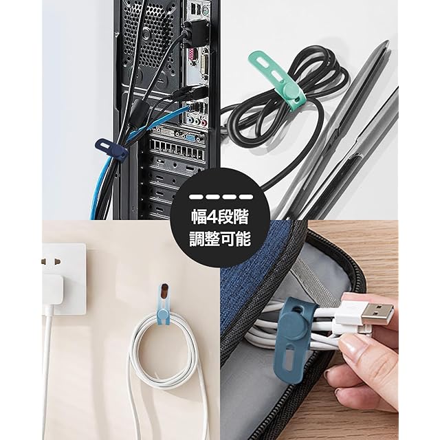 【4穴調整可能】束ねる太さも比較的自由で、延長すればもっと便利に活用できます。場合によって自由に留める位置を変えたいという方や、ケーブルバンド複数組み合わせて使う方にはこちらのコードバンドがおすすめです。