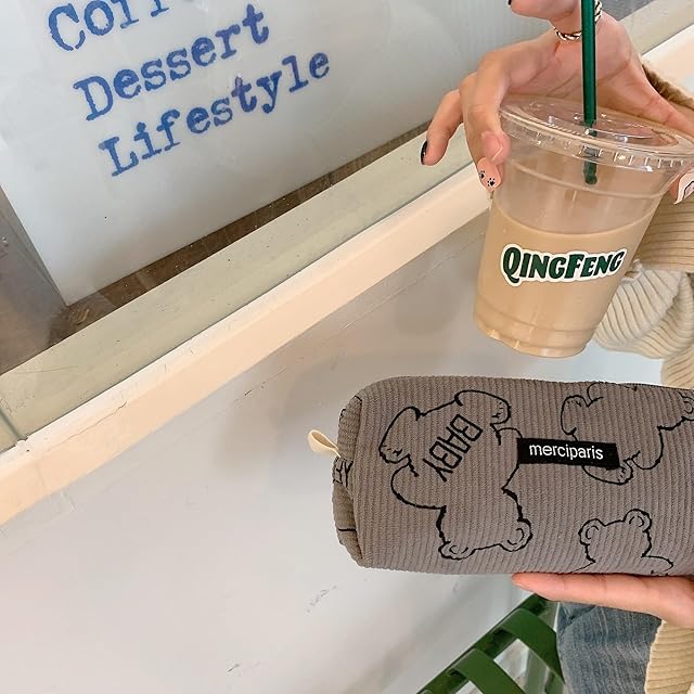 ZEWZE ペンケース 韓国 筆箱 大容量 おしゃれ かわいい 小物 ポーチ ペンポーチ 中学生 高校生 女の子 文房具 収納バッグ マルチポーチ 化粧ポーチ (グレー-クマ柄)