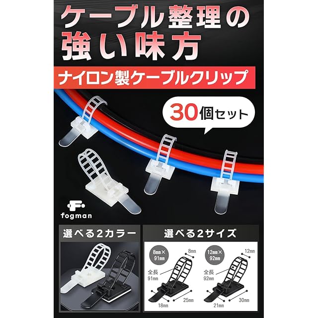 fogman 配線止め ケーブルクリップ コードクリップ ケーブルホルダー 固定 30個セット (ブラック 12mm x 92mm)