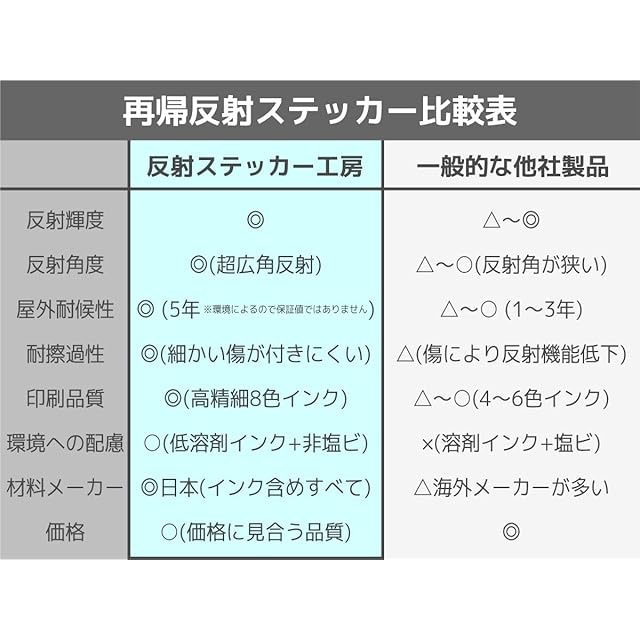 ■極めて浅い角度でもフルカラーで広角反射するので夜間も目立つ。 ■屋外耐候は驚異の5年(値ではありません)。塩ビ、ポリプロピレン(PP)製のステッカーのような早期退色・劣化はありません。 ■ハードコートで傷に強く、美観と反射機能が長持ち。■エナメルのような光沢と深みのある透明感は一般的なステッカーと比較して群を抜く高級感があります。 ■約240ミクロンの厚みと適度なコシで貼りやすい。 ■品質重視の高精細印刷。 ■キレイで長持ちする結局コスパの良いステッカー。 ■「反射ステッカー工房」はサブライムワンの商標登録(第6694321号)です。