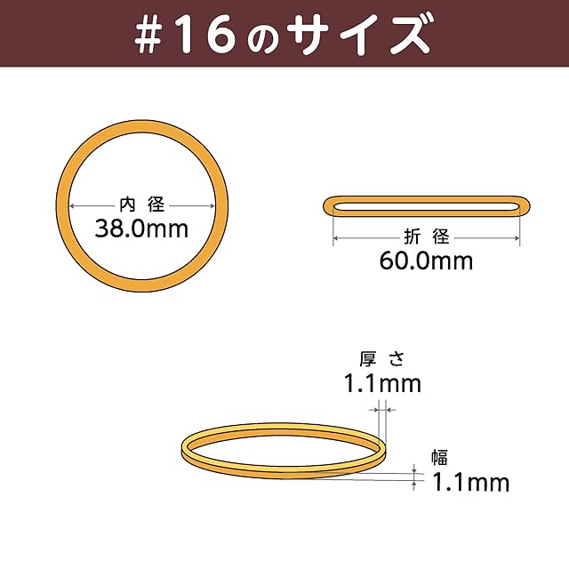輪ゴムのサイズ : #16 ( 16号 ) 内径38mm / 折径60mm / 切幅1.1mm / 厚さ1.1mm