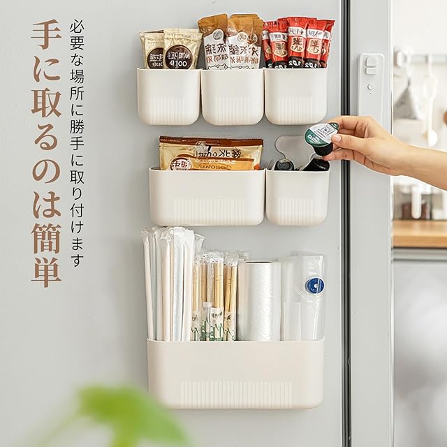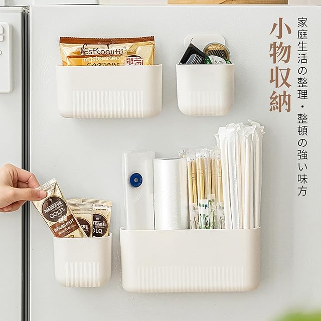 【小物収納】小物を収納するのに便利です。冷蔵庫のドアに磁石で貼り付けられるので、フードクリップや輪ゴムなど、散らかりやすい小物にベスト。冷蔵庫のドアやキッチンの壁面によく使用する小物を入れて、設置しておくといざというときも慌てずに済みますよ。