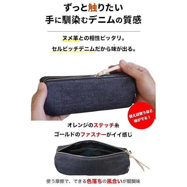 【デニム好きには、たまらない】あなただけの色落ちを楽しむ。マルチポーチ 小物入れ ペンケース 化粧ポーチ外装素材が注目を浴びる日本製デニムから「昔ながらの製法」のセルビッチデニムを使用で手触りがたまらない。安っぽいモノは嫌!というあなたにピッタリ見られて恥ずかしくないオシャレ大人に似合うポーチ。常に触るアイテム「ポーチ」は、通常、汚れて使用感がすごくなる。しかし、当商品に採用するデニムは、使うごとに出る使用感もスレて経年変化の味わいがでる。ファスナーの持ち手には、ヌメ革を使いこちらも使うたびエイジングでイイ感じの飴色に経年変化する。ファスナーのゴールドとステッチ糸のオレンジがデニム好きにはたまらない。多少の嵩張る小物も入る旅行にもおすすめの大容量マルチポーチ。