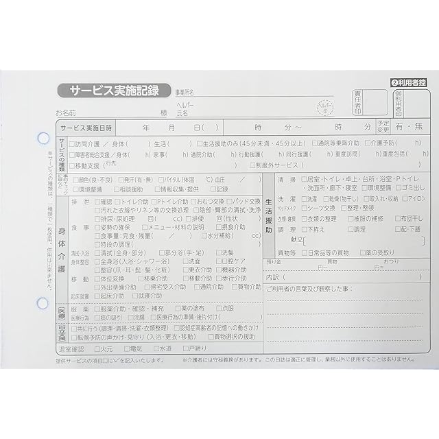 訪問介護用の伝票です。1枚目が事業者様の控用、2枚目が利用者様にお渡しする本紙となっています。訪問介護に必要な項目はある汎用の伝票です。
