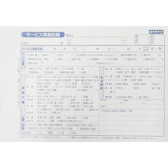 訪問介護伝票 訪問介護サービス実施記録用の伝票(既製品)です。
