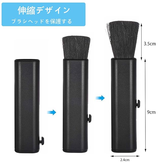 清潔ブラシ:全長125mm、ブラシ部35mm(短縮後:95mm*24mm)、材質:ハンドルはプラスチックABS、羊毛、包装内容:除電ブラシ*2個、色:黒 。