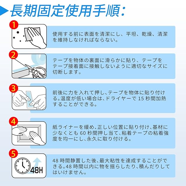 【多機能テープ】これは現在最強の両面テープです。私たちはその靭性を考慮しながら、粘着性を大幅に高め、テープが強い荷重に耐えられるだけでなく、取り外しやすく、跡が残らないようにしました。永続的な修復であれ短期的な修復であれ、必要なものを容易に満たすことができます<br>【はがしやすく傷がない】取り外し可能な両面テープは物体の表面に残留物が残らず、はがしやすく、繰り返し使用することができる。注意:壁のペンキがしっかりしていない場合、テープがはがされると壁がはがれる可能性があります<br>[超大型テープ]は、ドリルを必要とせずに壁に物をかけることができ、恒久的に固定することができます。製品マニュアルの手順に従って操作すれば、テープの最大粘度<br>[透き通った透き通った透き通った透き通った透き通った透明な両面テープは、時間が経つにつれて黄色になることはありません。DIYアイテムをよりきれいに仕上げることができる完璧なセロハンテープです<br>[多機能用途ですべてのニーズを満たす]この両面テープは、表面が滑らかなものにほとんど貼り付けることができます。どこにでも貼り付けることができます。例えば、画像、写真、フォトフレーム、壁紙、ポスター、フック、棚、携帯電話スタンド、カーペット、電源コンセント、祝日の装飾、DIYアイテムなどを固定したり貼り付けたりします。日常生活に欠かせない製品であり、あなたの生活に大きな便利をもたらします<br>