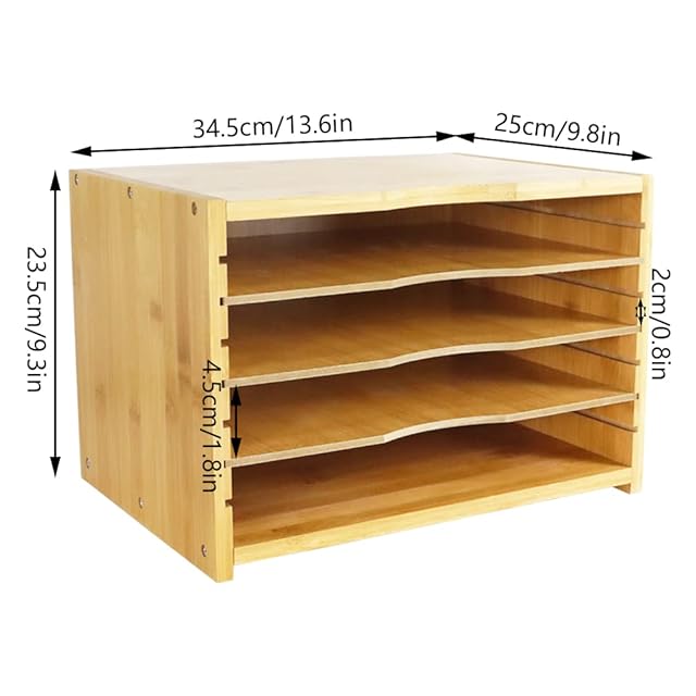 竹製ファイルボックスサイズ(幅x奥行×高さ):34.5x25x23.5cm/4段 お客様組立て品です。各調整棚には、より便利で安全な取っ手が付いています。