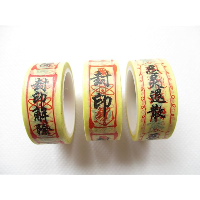 このマスキングテープは、M&Sブランドからの3種類セットです。封印、封印解除、悪霊退散の3つのデザインが含まれています。いずれもレッド、ブラック、イエローの3色から選ぶことができます。このテープはプラスチック製で、美術工芸に推奨されています。1個ずつ購入できます。