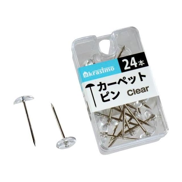 カーペットピン、24本入りです。 カーペットがずれるのを防止するピンです。 ヘッド部分が透明で目立ちにくいです。 1本のサイズ(約)・15×300mm 材質・スチール ポリスチレン メーカー名・(株)IMA
