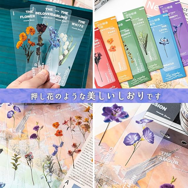 moin moin しおり ブックマーク 36枚セット 押し花 透明 クリア 防水 英字 おしゃれ 花 フラワー 美麗/リリー 百合 ユーカリ アイリス ポピー スズラン バラ 青 白 緑 黄 紫 オレンジ 赤 2501sor128